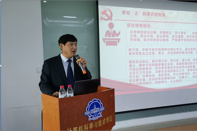 孙文博书记做了《勇于担当,敢于作为的基层领导干部》主题报告,他对行政干部提出了四点要求,一是要有“正”的意识想担当,做到政治过硬,牢固树立“四个意识”提高政治站位,善于观大势,把方向,谋大局,严守政治规矩,自觉做政治上的“明白人”,要学会用马克思主义的世界观和方法论来分析、思考和解决问题。二是要有“强”的责任敢担当,在其位谋其职,在其岗尽其责,落实好“一岗双责”,沉下心来,踏踏实实实做事,老老实实做人。三是要有“硬”的本领能担当,注意自身能力和素质的培养,坚持用创新的思维、改革的方法、率先的速度去适应新变化、解决新问题、求得新发展;四是要是有“实”的作风真担当,以认真、严谨、积极的态度去落实工作,真正担当起与职务与职责相称的责任,真正做到有多大的职务,就有多大的职责。孙文博书记为新上任的行政管理干部制订了系统的培训计划,要求他们认真参加14个单位的培训课程,要求行政干部每年要完成 “1+2+3”工程,即每位行政干部要讲一次党课或做一次专题调查研究,参观两次红色教育基地自我教育,读三本理论书籍,在工作中,要走在前列,干在实处,争做表率。孙书记强调,如果计算学部是一列火车,行政干部就是火车头,如果计算学部是一部动车,行政干部就应该做每节车箱的发动机。