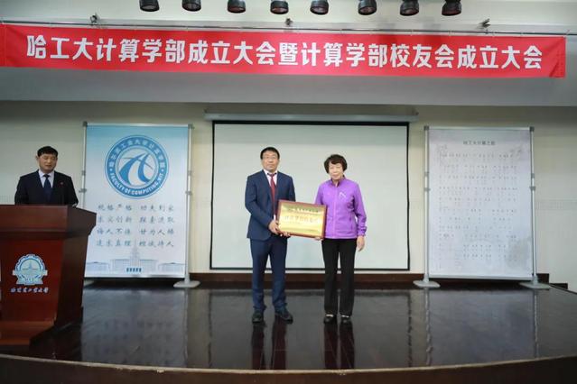 哈工大校友总会副会长崔国兰向计算学部校友会会长刘挺授牌