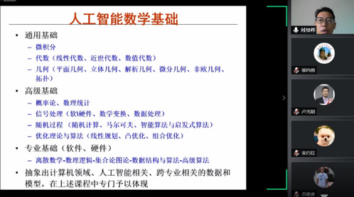 刘绍辉副教授则做了“人工智能相关的数学基础”报告,从人工智能涵盖的广泛领域、人工智能的发展、专业特色分析,梳理了人工智能需要的数学基础,建议整合课程、抽象出人工智能专业和跨学科相关内容。也指出目前通用数学基础、专业数学基础、专业问题分析建模之间,缺少必要的衔接。