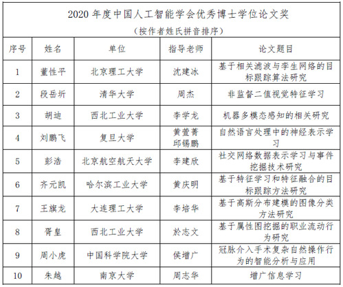 近日,2020年度中国人工智能学会优秀博士学位论文获奖名单正式公布。根据《中国人工智能学会优秀博士学位论文评选条例》的规定,中国人工智能学会组织9位国内人工智能领域的知名专家成立优博评审委员会,由学会名誉理事长李德毅院士担任评审委员会主席,认真负责地对2020年度中国人工智能学会优秀博士学位论文评选入围终评的20篇论文进行了评审,经专家终审及三轮无记名投票,最终确定了10篇论文获优秀博士学位论文奖和4篇论文获优秀博士学位论文提名奖。