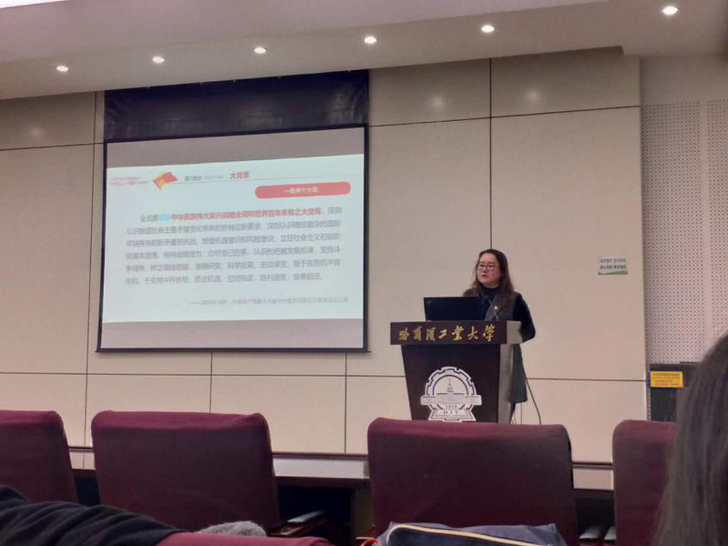 单既阳以哈工大建校100年来走过的风雨历程为切入点,以逐句解读方式,带领大家学习习近平总书记致哈尔滨工业大学建校100周年的贺信。着重介绍了哈工大自1920年建校以来,为国家培养了包括共和国勋章获得者孙家栋院士、国家最高科学技术奖获得者刘永坦院士等在内的一大批杰出人才,打造了包括新体制雷达、星地激光链路等在内的一大批国之重器,精彩的讲述令在场学生倍感振奋。她指出习近平总书记的贺信,充分体现了党和国家对哈工大发展建设的高度重视和亲切关怀,在中华民族伟大复兴的战略全局和世界百年未有之大变局交汇之际,全体哈工大人要牢记习近平总书记贺信精神和重要嘱托,以激扬奋进的姿态,不断改革创新、奋发作为、追求卓越,为努力实现“两个一百年”奋斗目标和中华民族伟大复兴的中国梦作出自己的青春贡献。