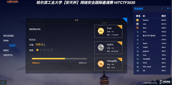 2020年12月6日14时,哈尔滨工业大学“安天杯”网络安全国际邀请赛HIITCTF2020竞赛环节圆满结束。国内外36支高校战队历经了24个小时不间断的激烈线上比拼,最终清华大学Redbud战队以总分2425分荣获冠军,哈尔滨工业大学Lilac战队以总分2215分夺得亚军,吉林大学Spirit战队以总分1685分获得季军。成都理工大学Dino和俄罗斯国立技术大学Kbsp等6只战队荣获优胜奖。