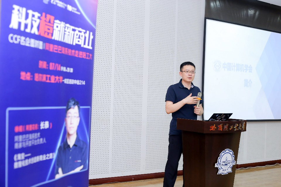 王忠杰教授代表计算学部欢迎阿里巴巴为学生们分享淘系技术并致开幕辞。同时为在场的学生介绍CCF的活动、宗旨和愿景,讲解CCF的会员权益并号召学生们加入。
