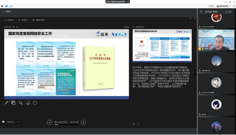 12月15日晚,计算学部2003202班企业班主任、安天科技集团股份有限公司研究院副院长、集团技术委员会常务副主任李柏松为全体同学带来了以网络安全产业发展与信息安全领域热点技术为主题的线上交流分享会。班主任叶麟、辅导员王迪参加活动。