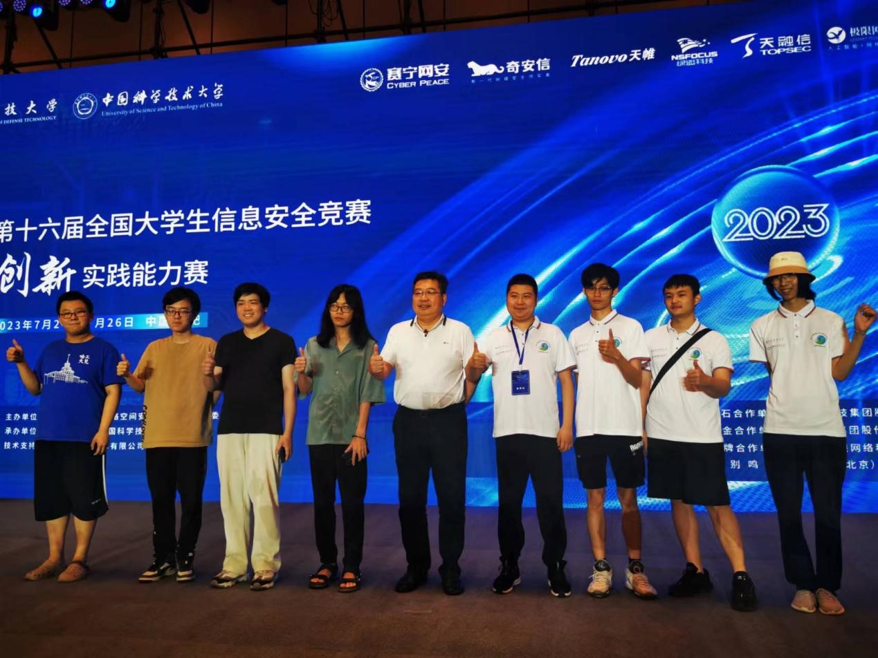 第十六届全国大学生信息安全竞赛“创新实践能力赛”全国总决赛由中央网信办指导、教育部高等学校网络空间安全专业教学指导委员会主办,国防科技大学与中国科学技术大学联合承办。于2023726-27号在安徽合肥举行。竞赛共吸引全国500余所高校、2494支战队,共8242人报名参赛,经过线上初赛和分区赛层层选拔,80支优秀战队成功入围全国总决赛。我校两支战队分获一等奖和三等奖。