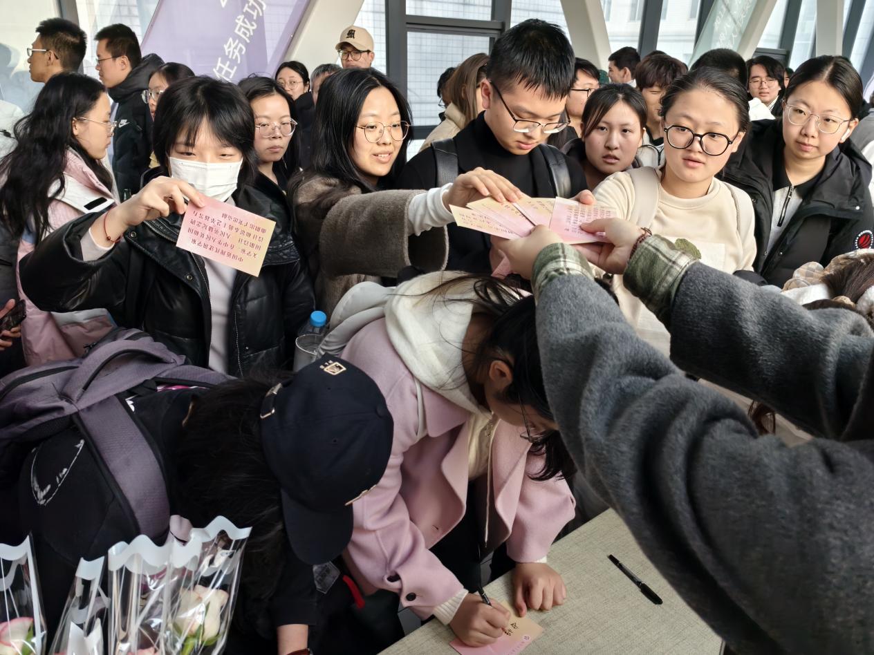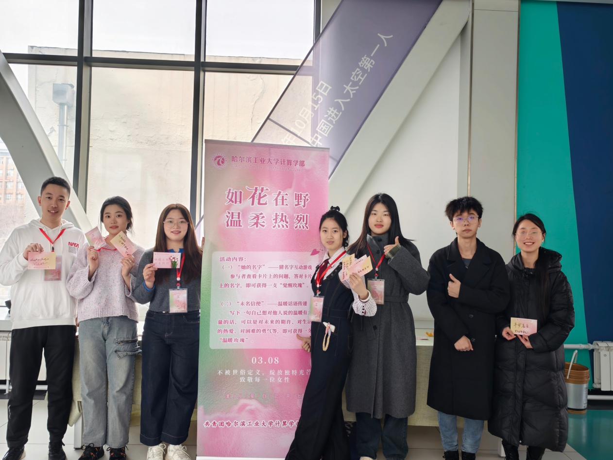 主题活动包含“她的名字”和“未名信使”两个环节,通过互动游戏与贺卡传递的形式播撒温暖与力量。在“她的名字”活动中,参与者抽取妇女节特色文创卡片,根据卡片上叙述的杰出女性事迹,回答出对应人物姓名。答对题目的同学获赠一枝玫瑰花和一张带有温暖话语的贺卡。在“未名信使”活动中,师生们在贺卡上写下真挚祝福。工作人员将写好的贺卡随机赠送给下一个同学。活动期间,师生们在贺卡上写下“愿所有女性都能在自己热爱的领域闪闪发光”“祝HIT越来越好,计算学部越来越好”等暖心话语,让每一位参与活动的同学感受到不期而遇的温暖。