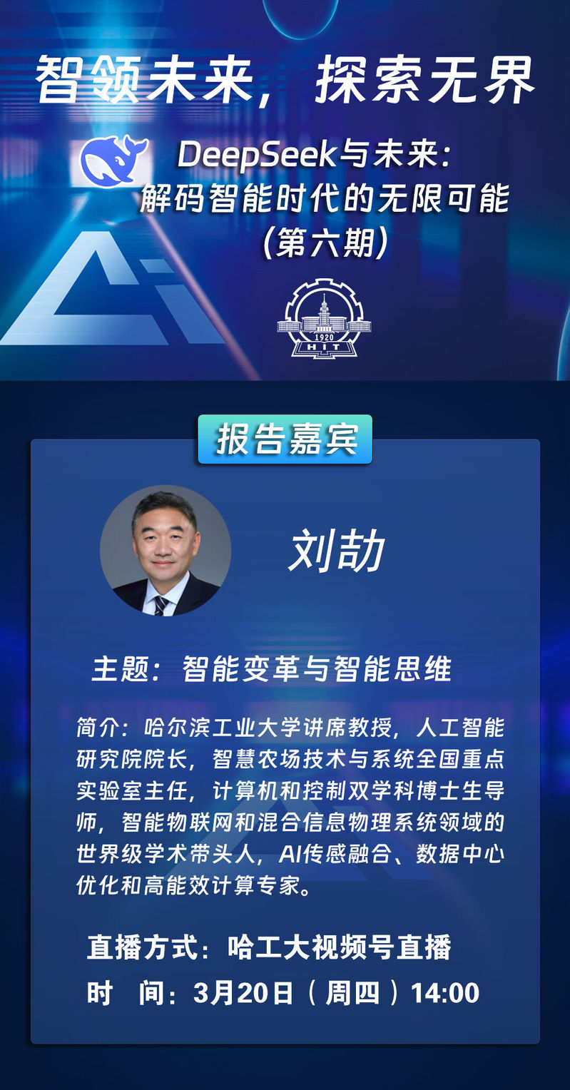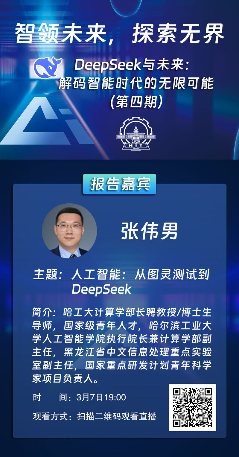 在DeepSeek等大语言模型引领人工智能技术革新浪潮,深刻重塑教育、科研与社会发展的新时代背景下,2025年3月,哈尔滨工业大学本科生院立足前沿,面向全校教师精心打造“智领未来,探索无界——DeepSeek与未来:解码智能时代的无限可能”系列培训,旨在赋能教师群体,系统掌握人工智能前沿技术,全面提升教学创新能力,推动AI技术与教育实践的深度融合,为培养具有全球视野和跨学科能力的创新型人才提供坚实支撑。计算学部张伟男、李海峰、刘劼三位教授倾情助力,结合自身教学、科研经历对智能时代人才培养进行了系统阐述和深入解读。