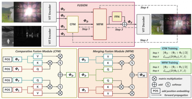 近年来,随着成像技术的飞速发展,如何有效整合来自多个传感器的信息,以提升信息感知的丰富度,已成为研究的前沿热点。多模态图像融合技术在自动驾驶、智能安防等领域的广泛应用,标志着这一技术的巨大潜力与价值。本研究专注于红外与可见光图像的融合,旨在更好地保留两个模态中的语义信息。当前的研究常常依赖下游任务的损失来约束融合网络的训练,以提升融合效果。然而,由于下游任务标签融合数据稀缺,过拟合现象时有发生,严重影响了模型的泛化能力。针对这一挑战,本文创新性地提出了一种基于预训练编码器的融合方法。通过自监督训练获得的编码器,能够有效保留底层与高层视觉信息,使我们能够在拥有大量语义信息的图像编码空间中进行高效融合。此外,采用两阶段训练策略,显著加快了模型的收敛速度。实验结果表明,该方法在融合效果上优于传统的下游任务驱动方法,为多模态图像融合技术的未来发展开辟了新的方向。