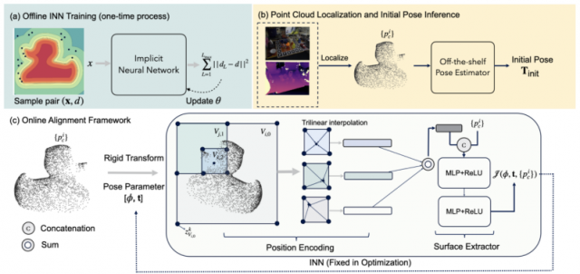6D位姿估计(包含3D旋转和3D平移)是机器人操控、3D场景理解、增强现实等应用的核心技术步骤。传统方法依赖迭代最近点ICP(Iterative Closest Point)算法进行位姿优化,但ICP需要显式建立点云与3D模型的一一对应关系,易陷入局部最优且对噪声和遮挡敏感。研究团队提出了一种基于隐式神经网络的优化框架,通过将目标物体的3D模型编码为符号距离场(SDF),直接优化点云与模型表面的距离,无需显式匹配对应点。该方法具有以下优势:1)高效性:离线训练仅需4-5分钟,在线优化实时完成。2)鲁棒性:对初始位姿偏差大、噪声、尺度变化及遮挡等复杂场景表现优异。 3)通用性:可无缝集成至现有位姿估计流程,无需额外标注数据。